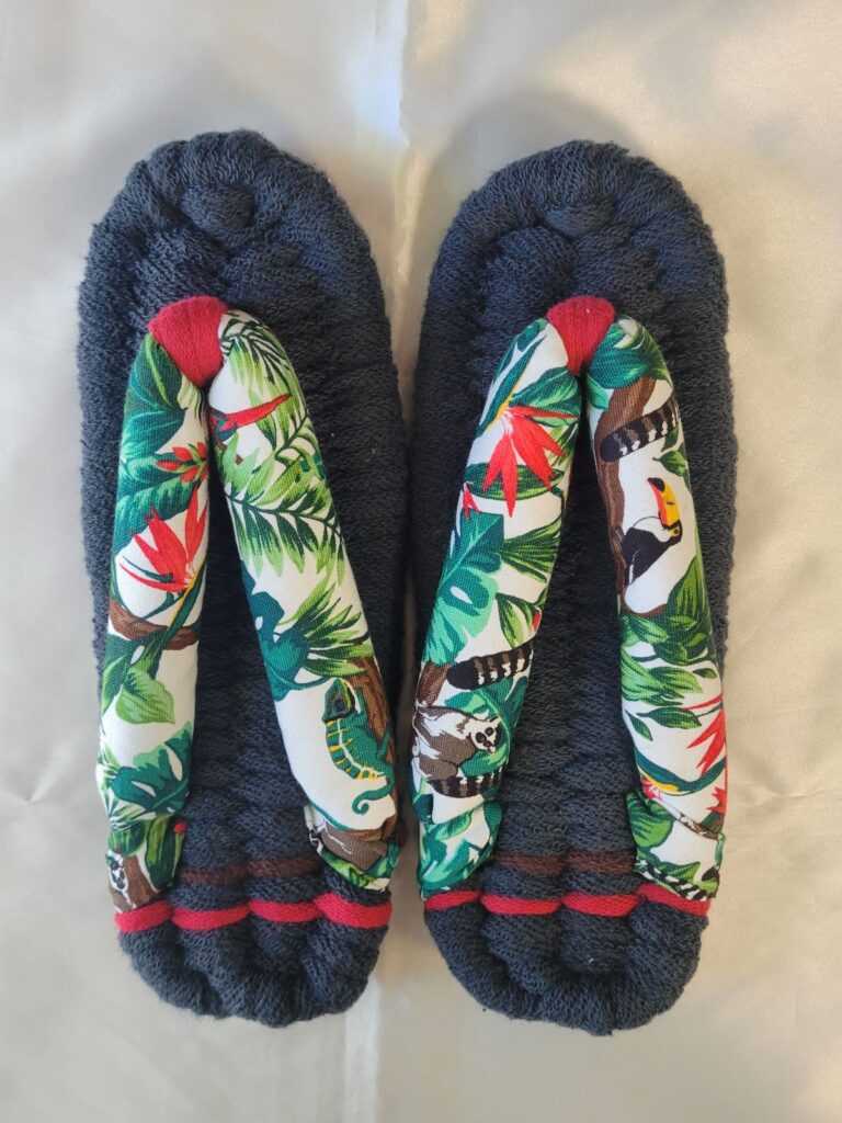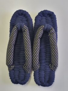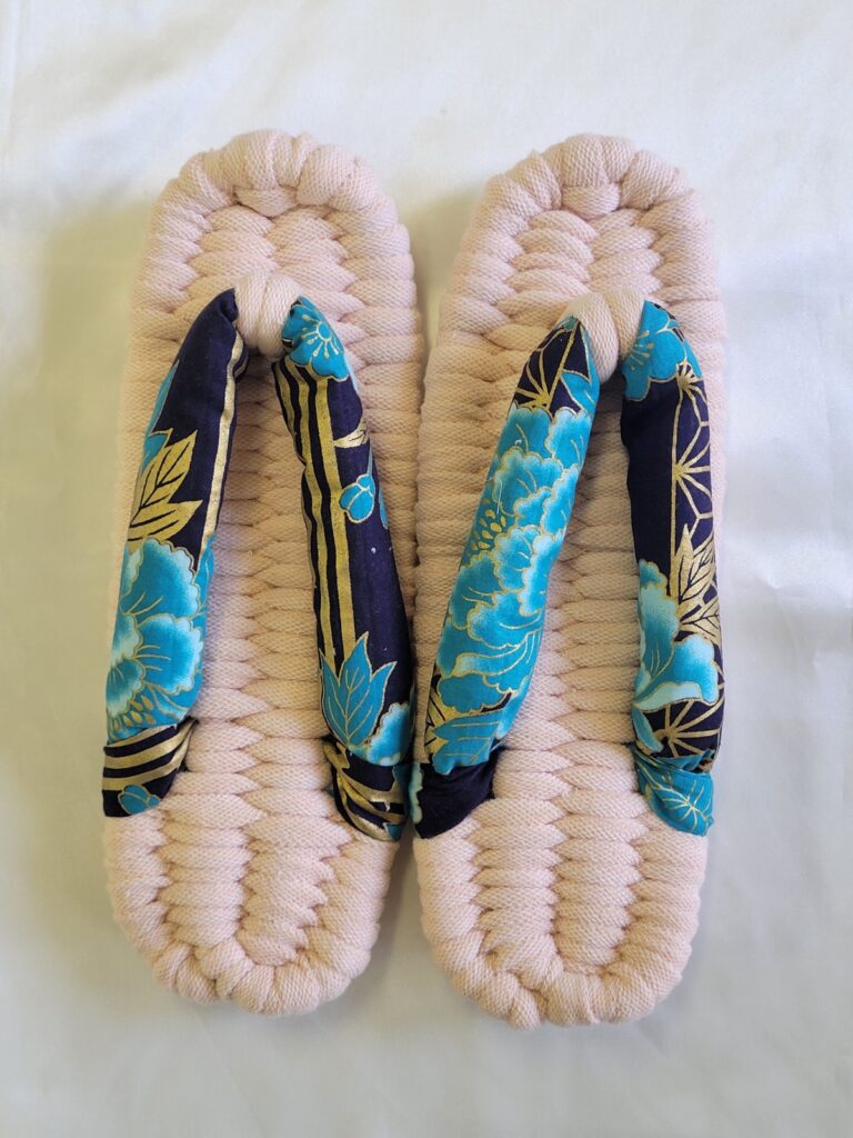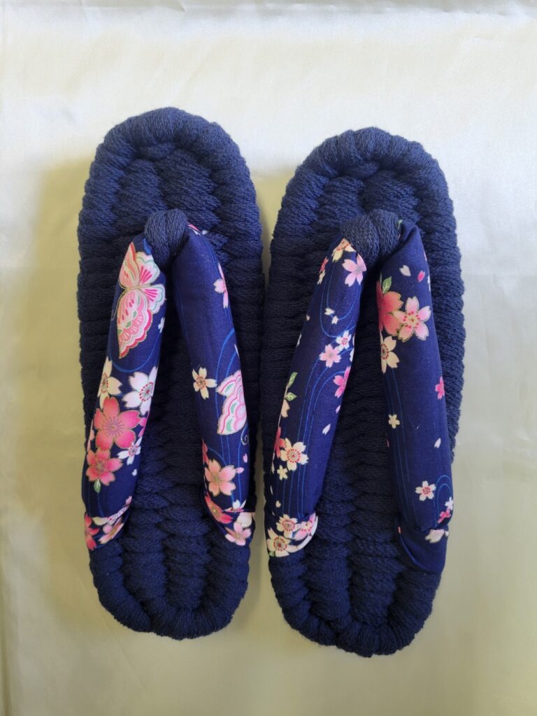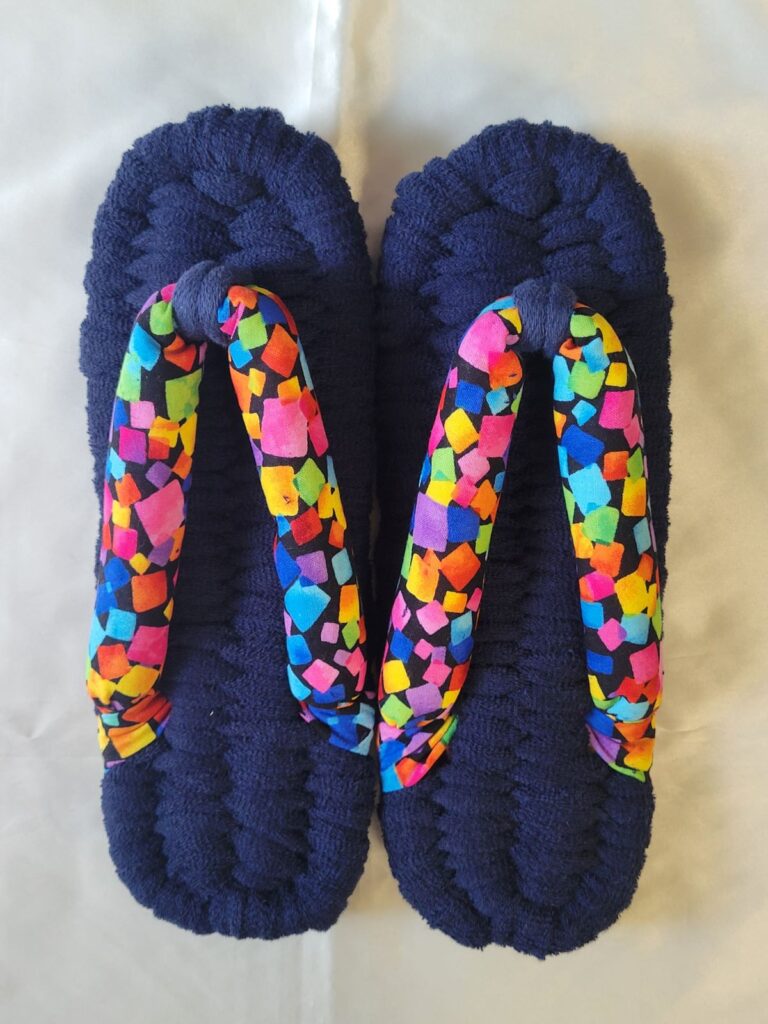 3足目です 紺色のベースに和柄の鼻緒を組み合わせて華やかなモダンジャパニーズの布ぞうりが完成しました 幅も出せていますね