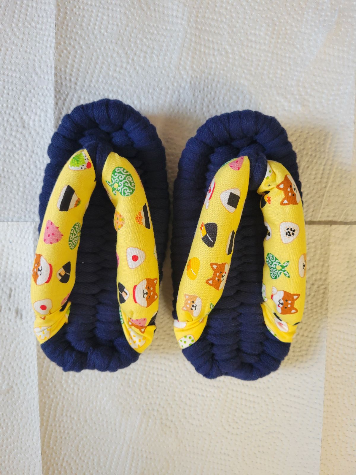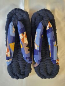 2足目です 息子さん用に大きめサイズ 紺色のベースに同系色のバンダナ柄を組み合わせたおしゃれな布ぞうりが完成しました 履き心地も良さそうです