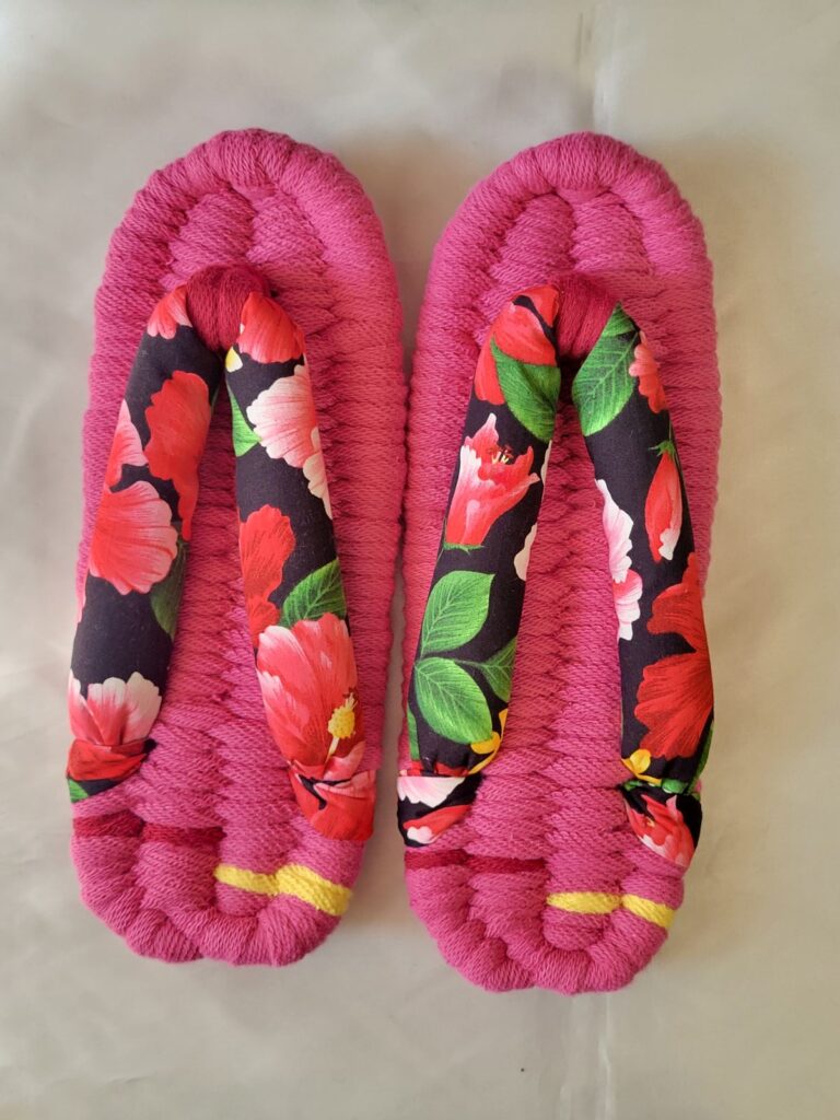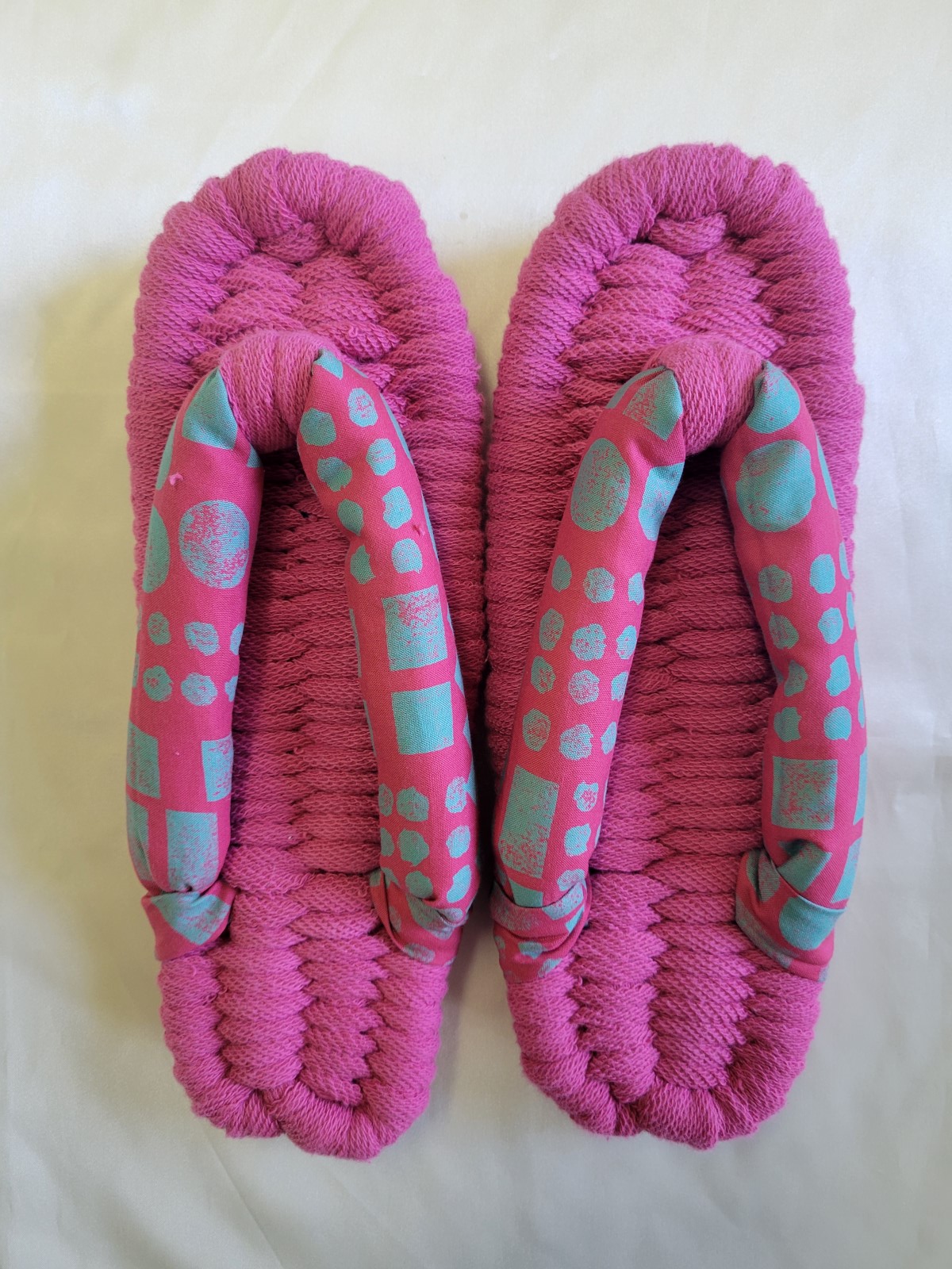 4足目です ピンクのベースに同系色のモダンな鼻緒を組み合わせてPOPな布ぞうりが出来上がりました 編み目もしっかり側面も綺麗に仕上がりました