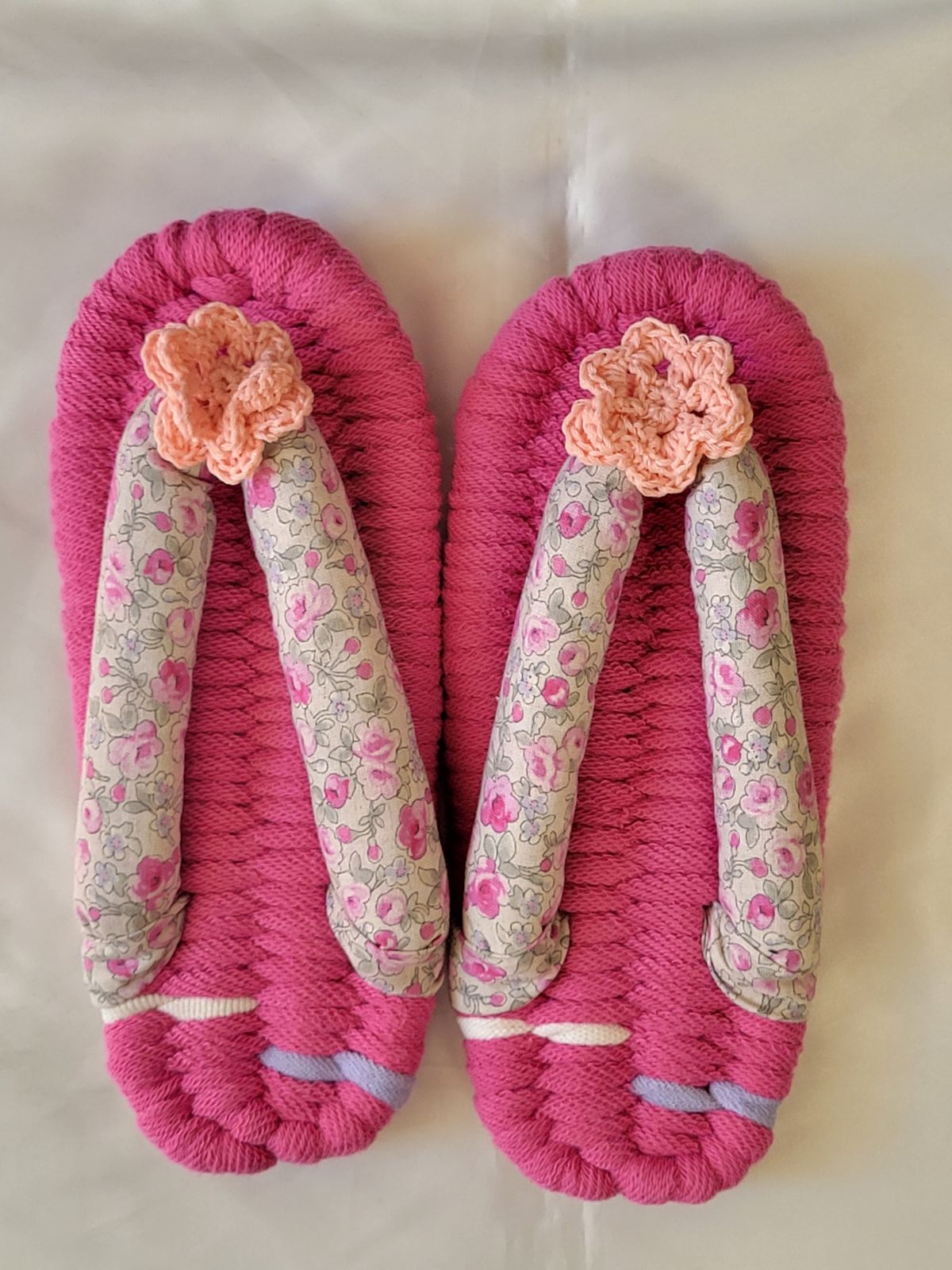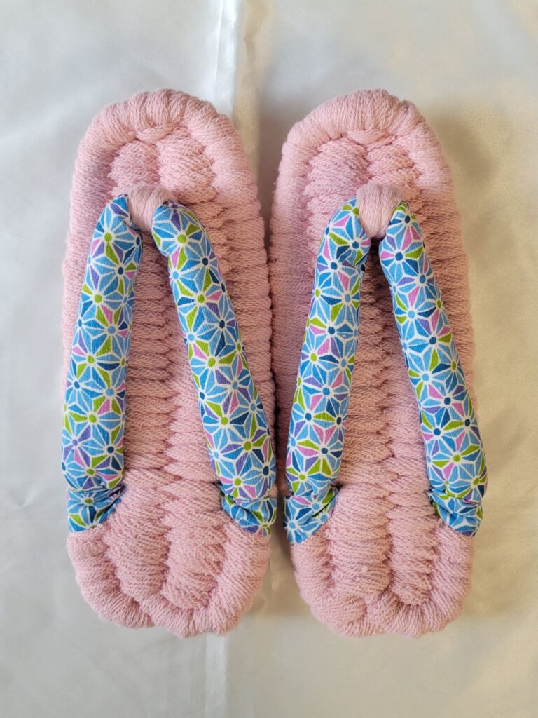 3足目です 娘さん用に作られました ピンクのベースに桜の柄の鼻緒がマッチした可愛い1足です 編み目も整っています