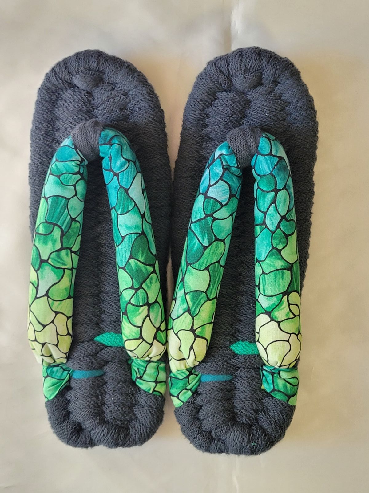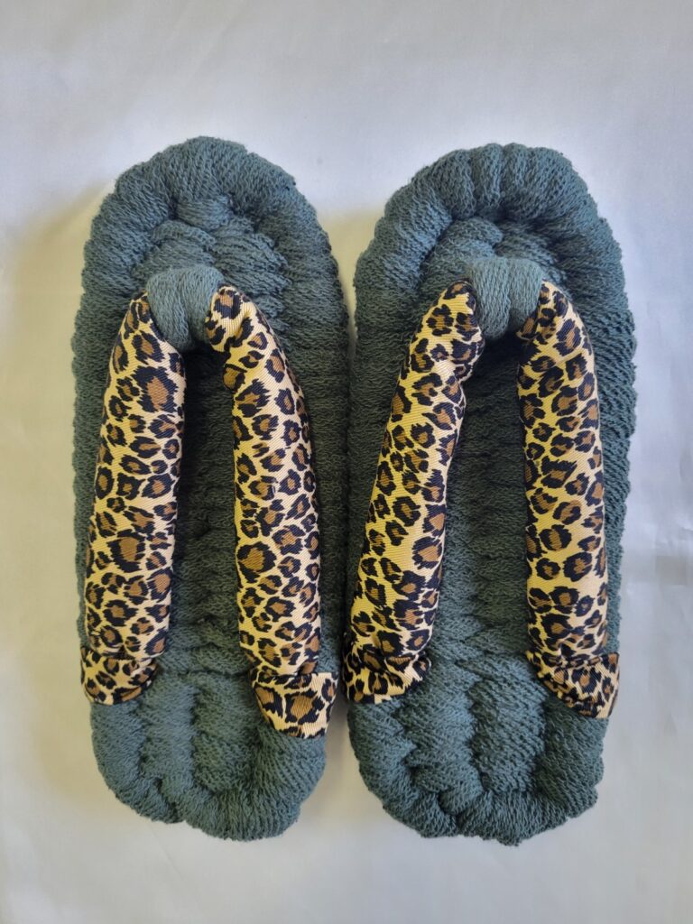 5足目です ブルーグリーンのベースに豹柄の鼻緒がマッチしておしゃれに完成です 落ち着いた雰囲気に出来上がりました 厚みも出ています