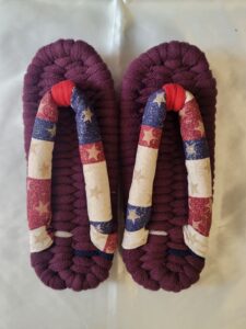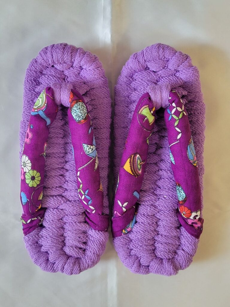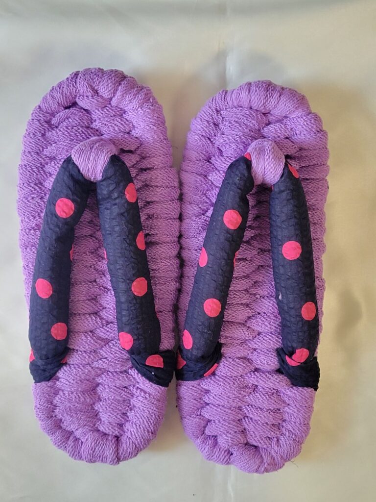 ご自宅で作られました パープルのベースに和柄の鼻緒が映える爽やかな布ぞうりが出来上がりました 左右の形も整っています