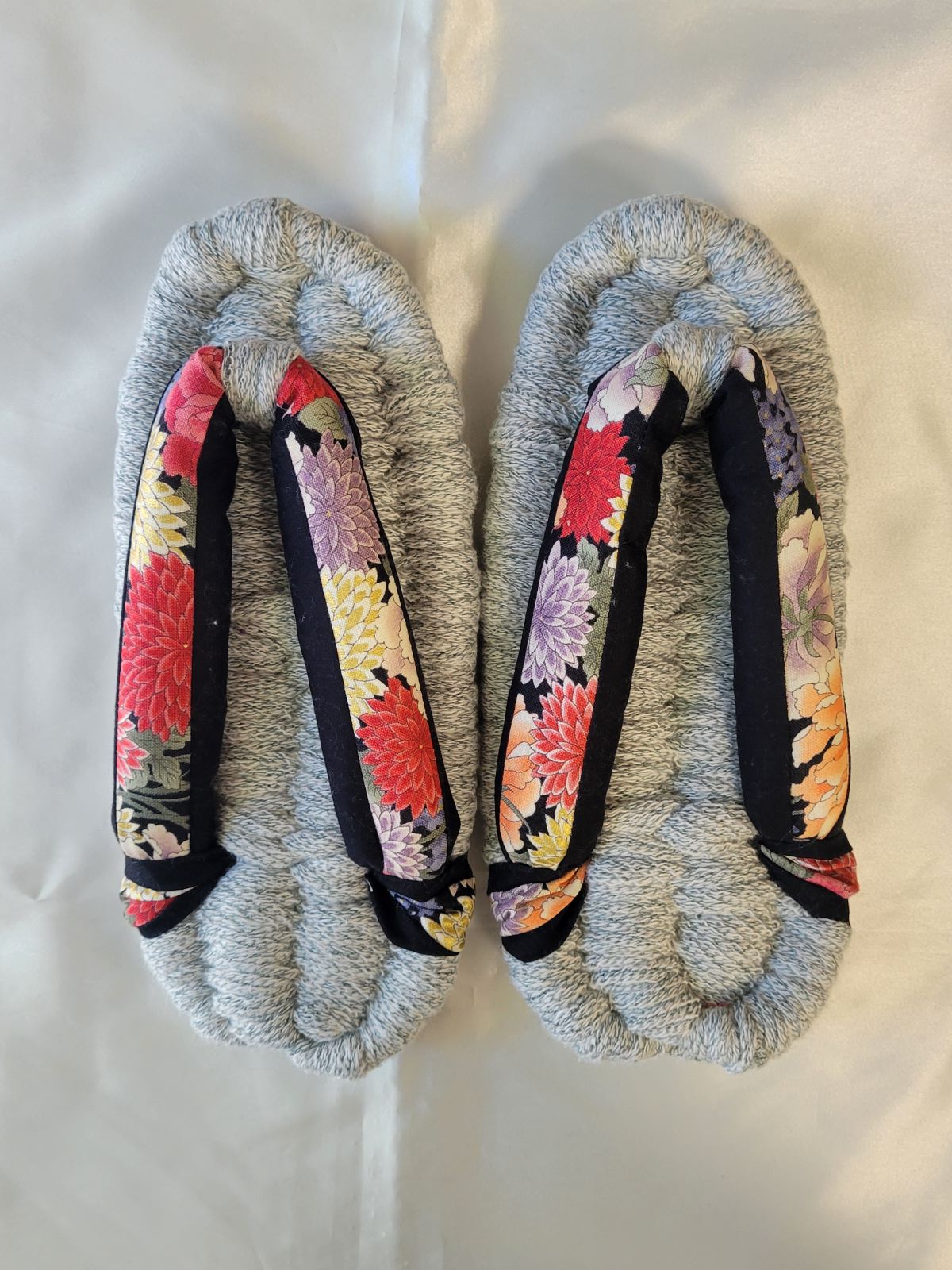 1足目です グレーのベースにフラワー柄を組み合わせておしゃれな布ぞうりが出来がありました 形も揃っています