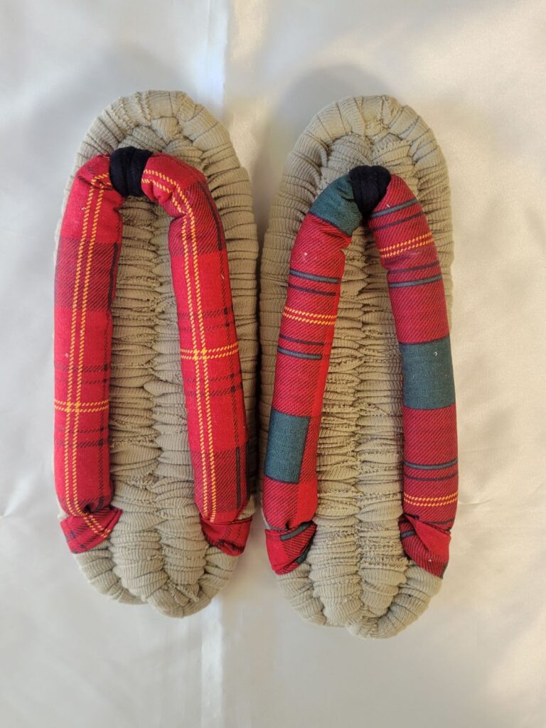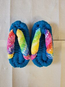 4足目です 茶色のベースにハワイアンの鼻緒が引き立ちおしゃれな布ぞりが完成しました 細い生地でしたが編み目が綺麗にできました