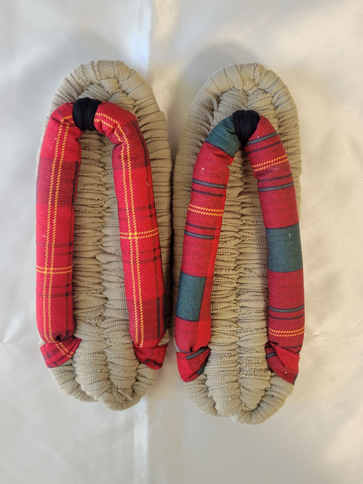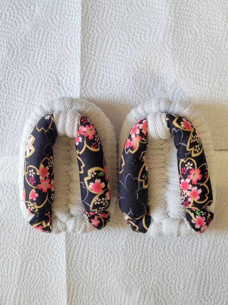 ご自宅で作られました グレーのベースに和柄の鼻緒が引き立つ素敵な布ぞうりに仕上がりました。 ご自宅で一人で作ると勉強になりますね
