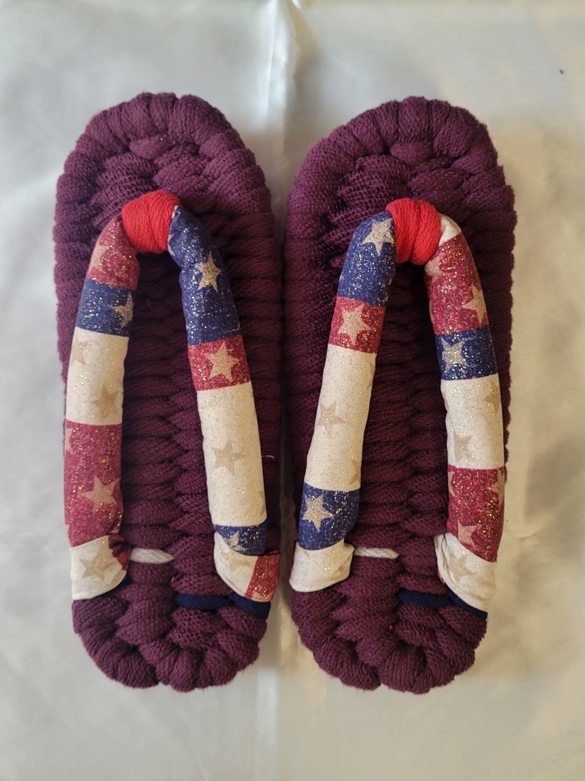 アドバンスコース ボルドー色のベースにアメリカ輸入生地のアメリカン柄を組み合わせたPOPな布ぞうりです 差し色もアクセントになっています