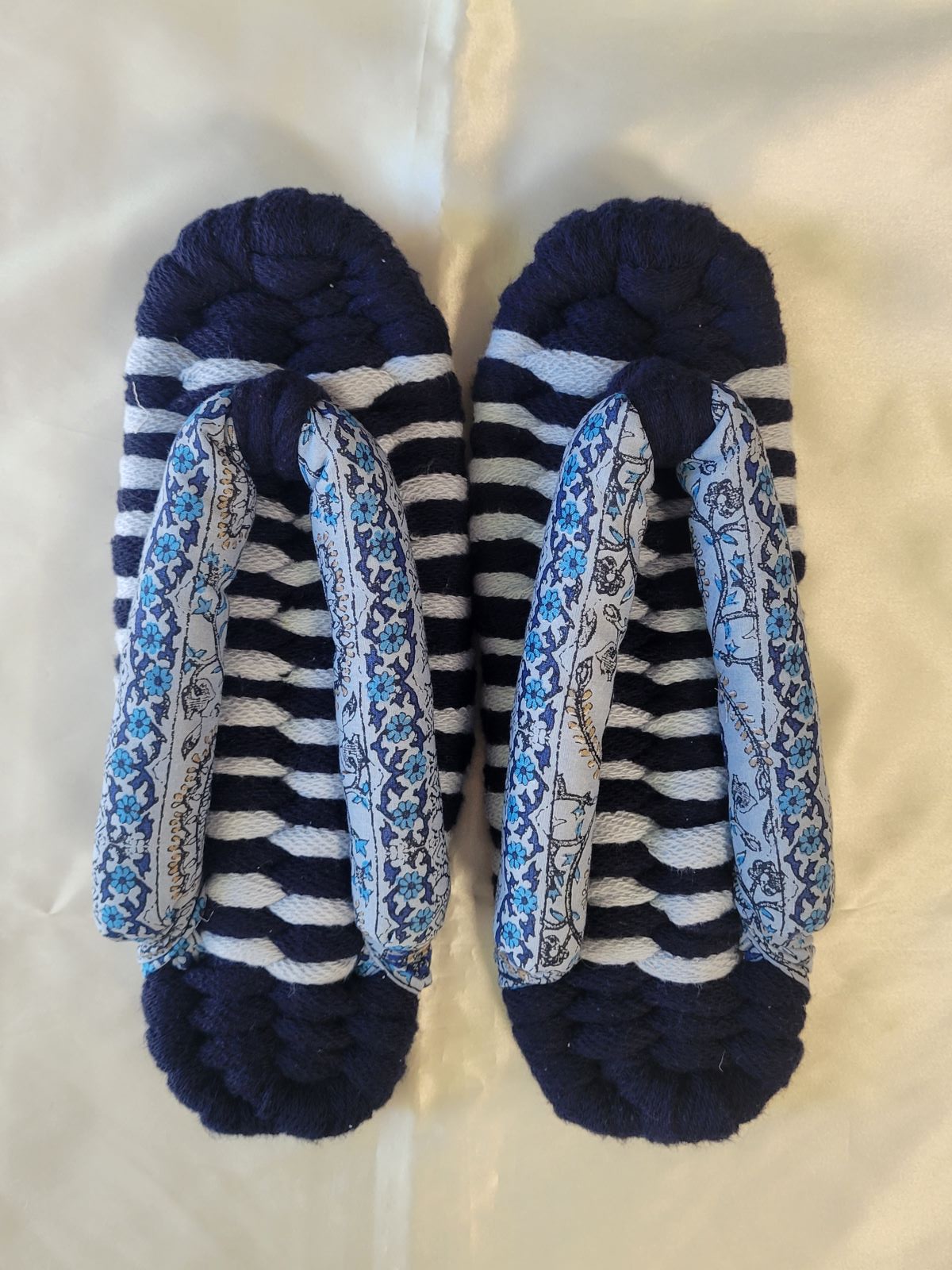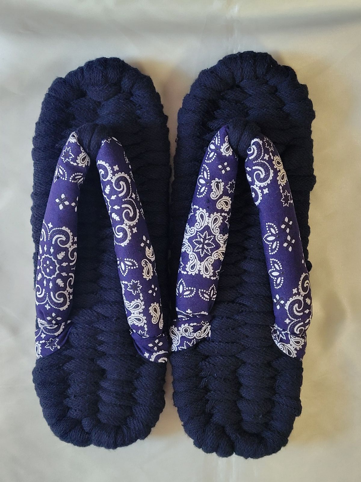 2足目です 紺色のベースに鼻緒に同系色のバンダナ柄を組みあわせて同一感があっておしゃれな1足です。ふんわりと編まれて履き心地も良さそうです