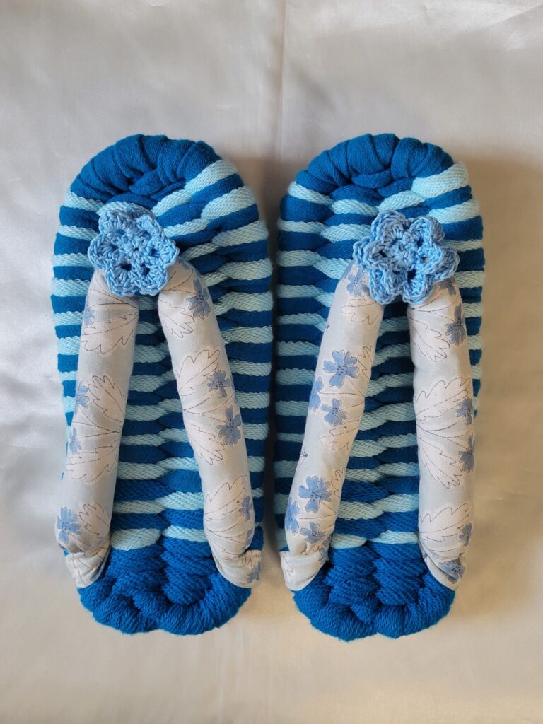 3足目 フリース布ぞうり ブルーのベースにブルーのフラワー柄の鼻緒が映えておしゃれな布ぞうりです フリースはコットンの生地より少し難しいですがしっかりと編まれています