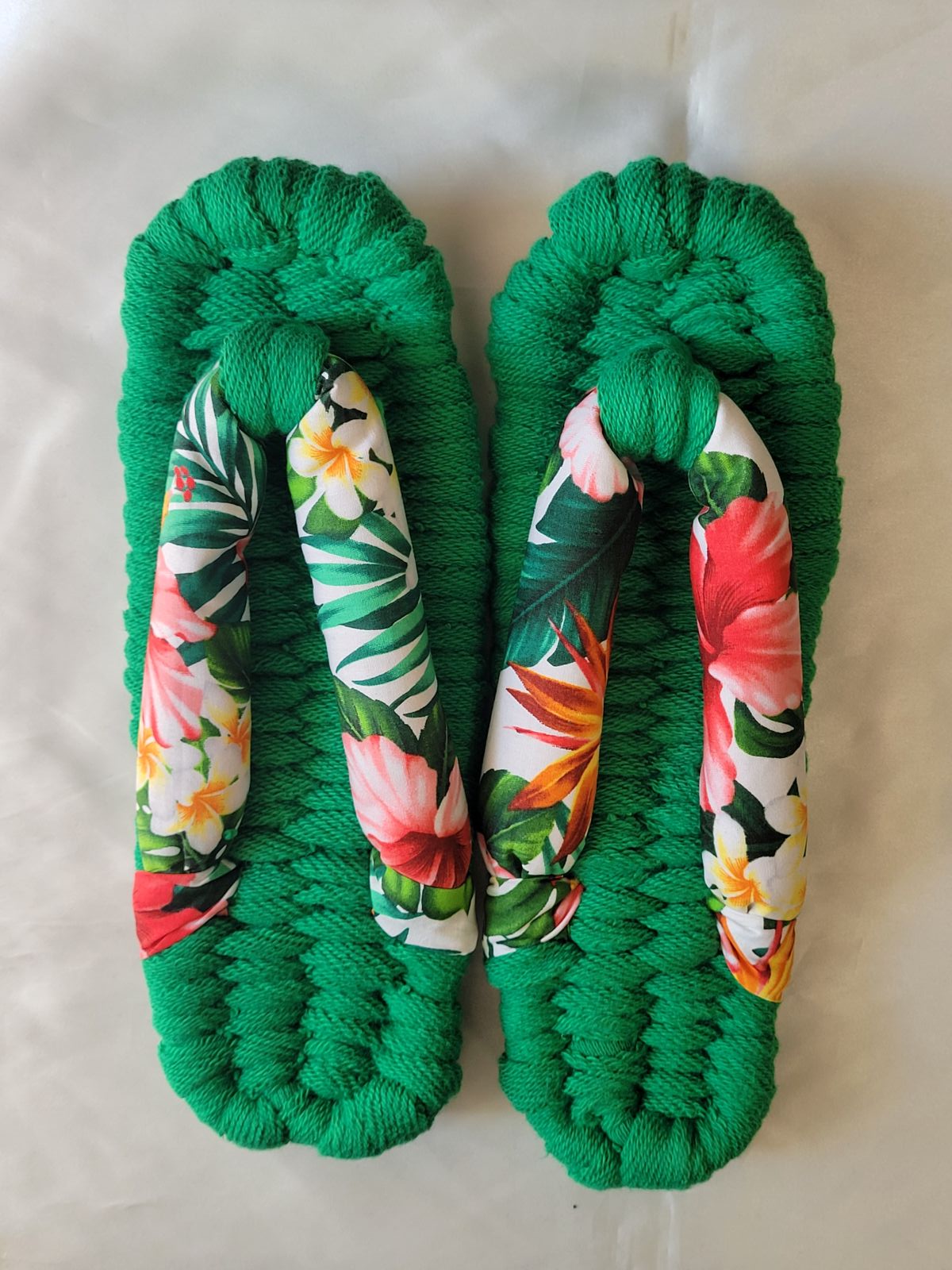 1足目です グリーンのベースにハワイアンの鼻緒がマッチして素敵な1足が完成しました しっかりと編まれました