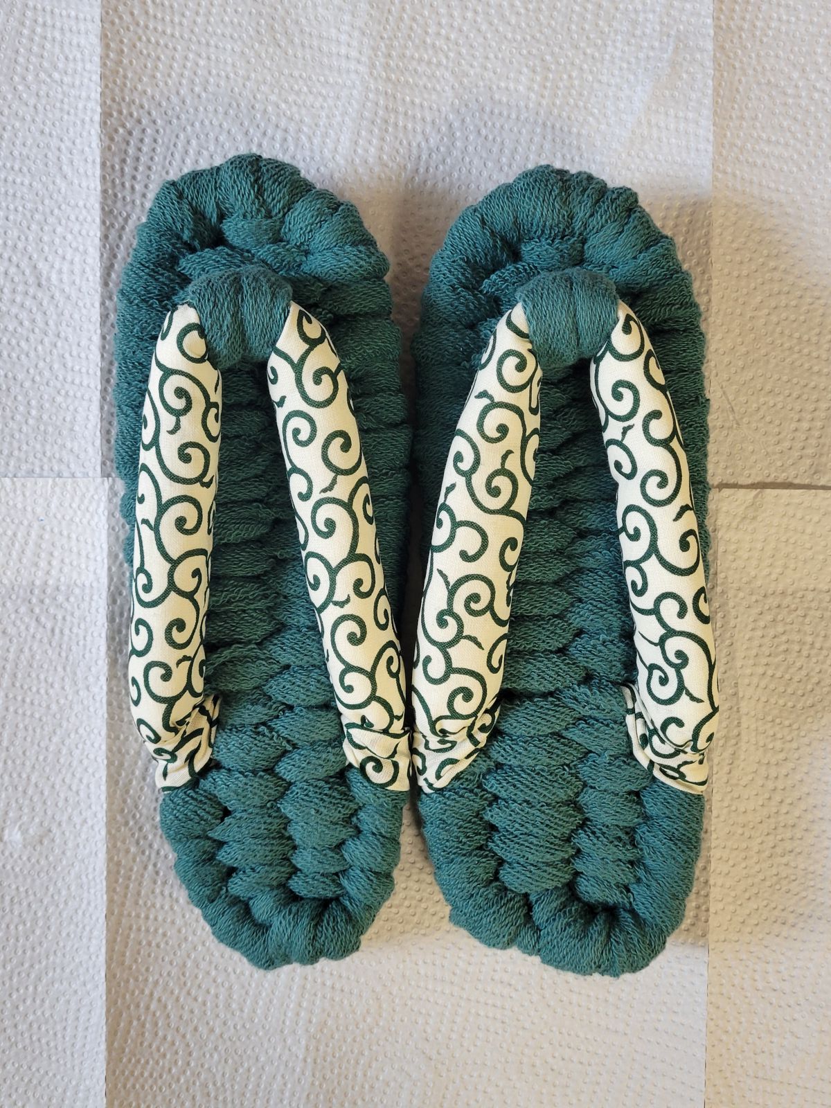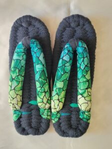 4足目です ブルーグリーンのベースに唐草模様の鼻緒が引き立つモダンジャパニーズの布ぞうりが出来上がりました。しっかりと編まれています