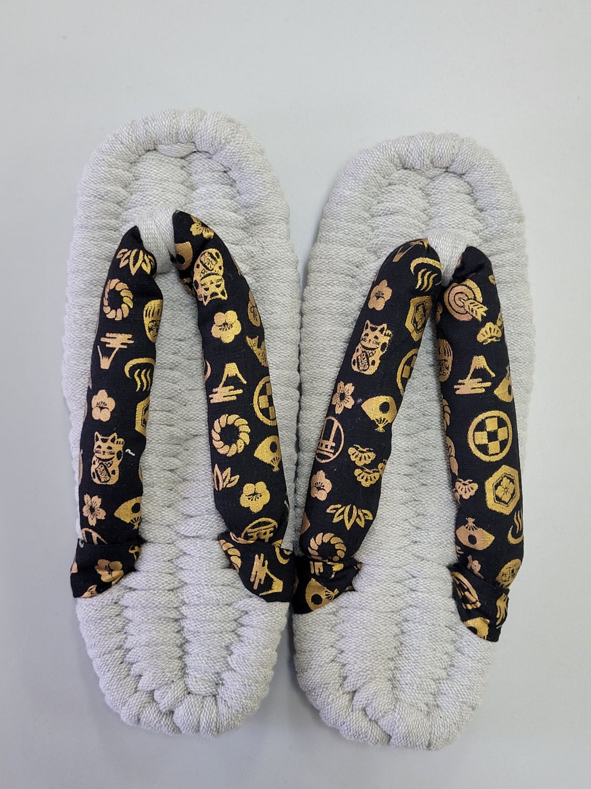 2足目です 黒のベース歌舞伎柄の鼻緒を組み合わせて粋な布ぞうりが出来上がりました。幅も出せてしっかりと編まれています