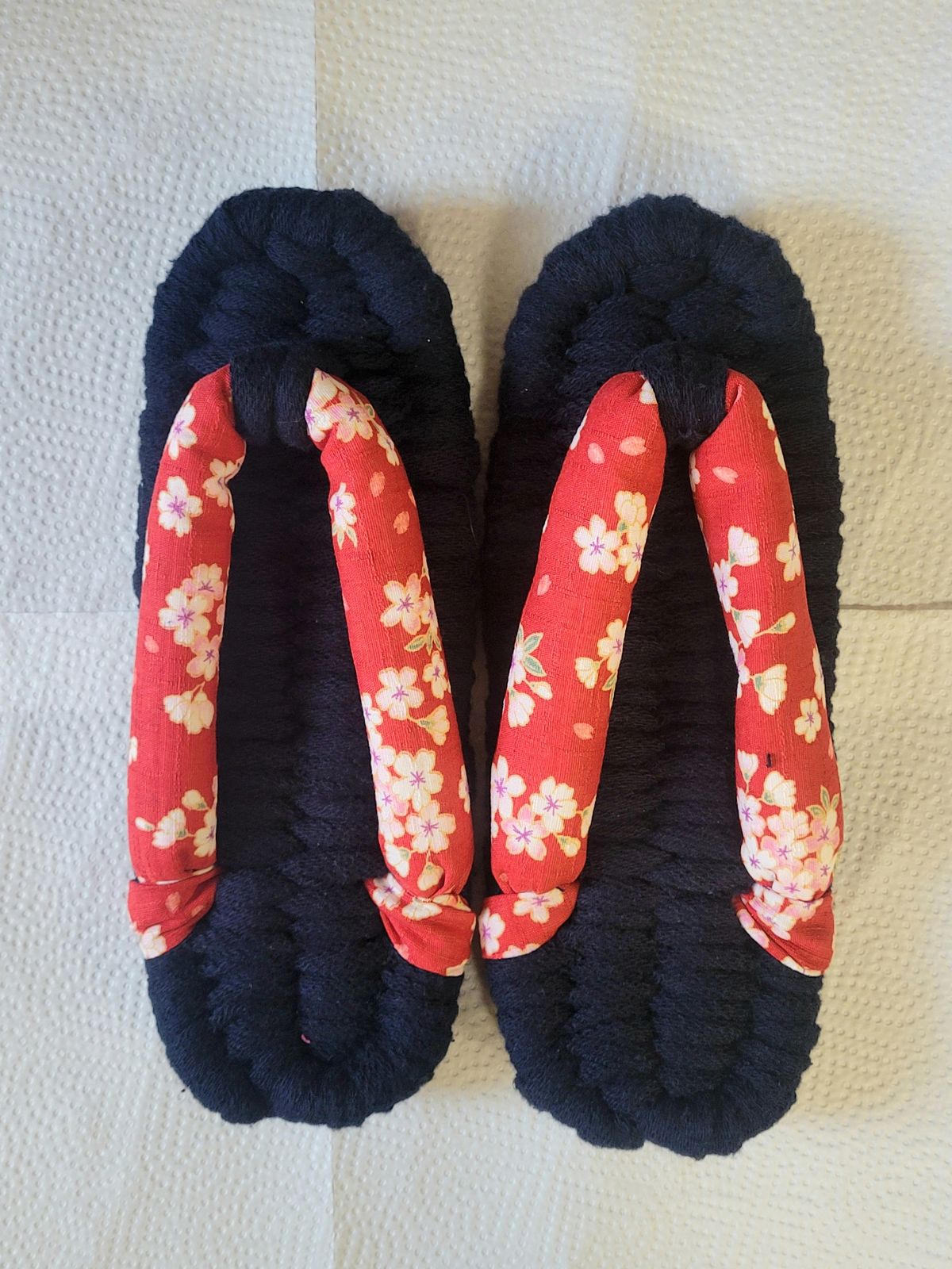 7足目です プレゼント用です 紺色のベースに桜柄の鼻緒が引き立つ華やかな布ぞうりです しっかりと編まれています