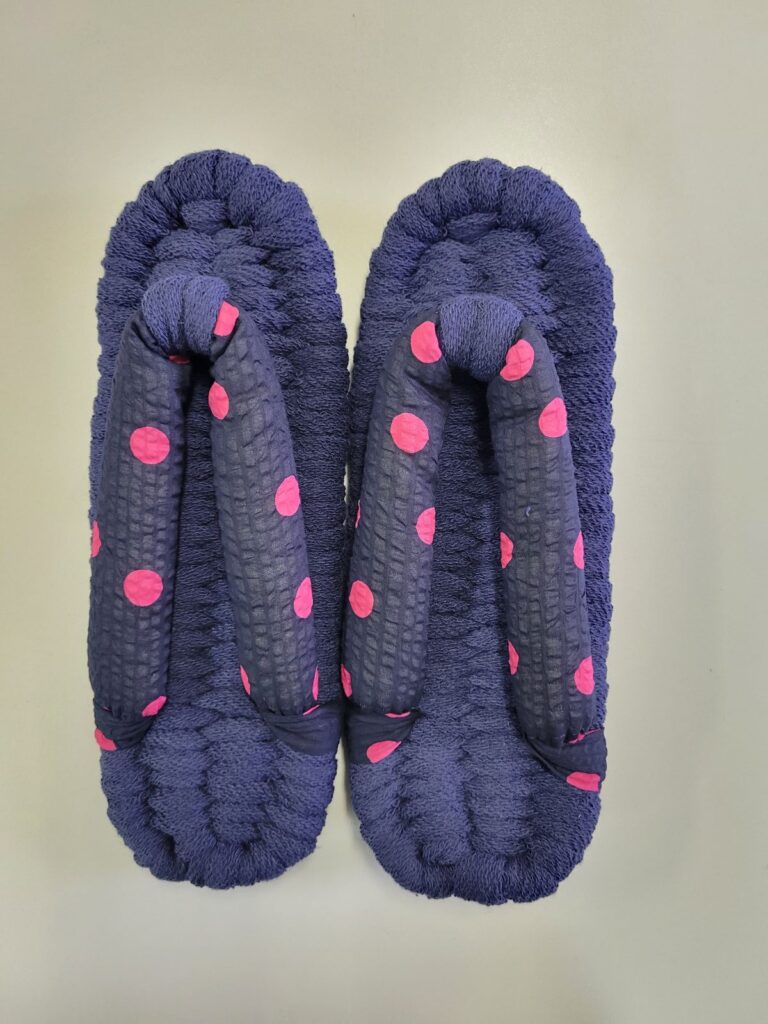 6足目です 紺色のベースにピンクの水玉模様の鼻緒がマッチしたPOPな1足です 左右の形も同じで完成度が上がりました