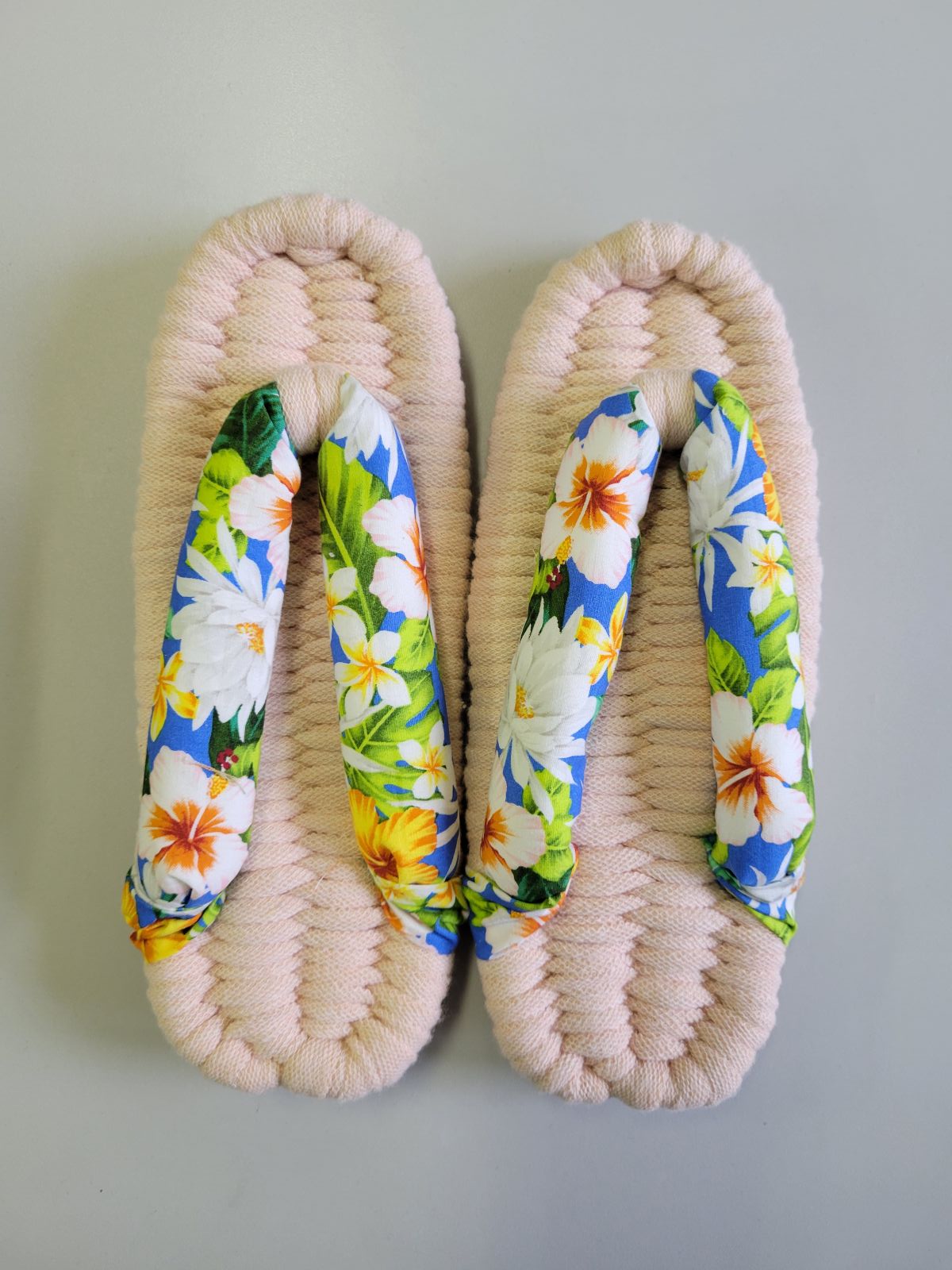 5足目です ライトピンクのベースにハワイアンの鼻緒がマッチして可愛い布ぞうりです リゾート気分になりますね