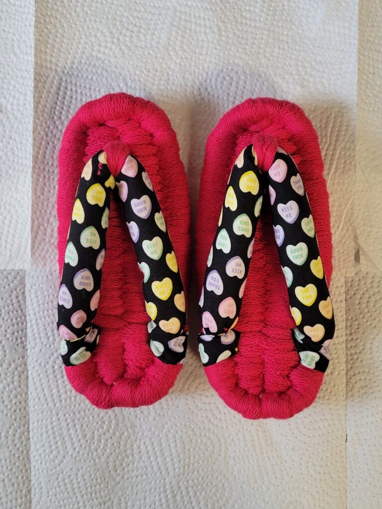1足目です ピンクのベースにハートの鼻緒がマッチして可愛い1足が完成しました