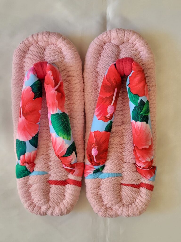 4足目です ピンクのベースにフラワー柄の鼻緒を合わせて華やかな1足が完成しました