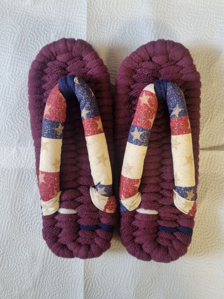 4足目です エンジ色のベースに和柄の鼻緒を組み合わせて上品な布ぞうりに仕上がりました
