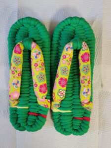 2足目です ブルーグリーンのベースに金色が入った和柄の鼻緒が華やかに引き立つ布ぞうりが出来上がりました。立体的に編めるようになりました