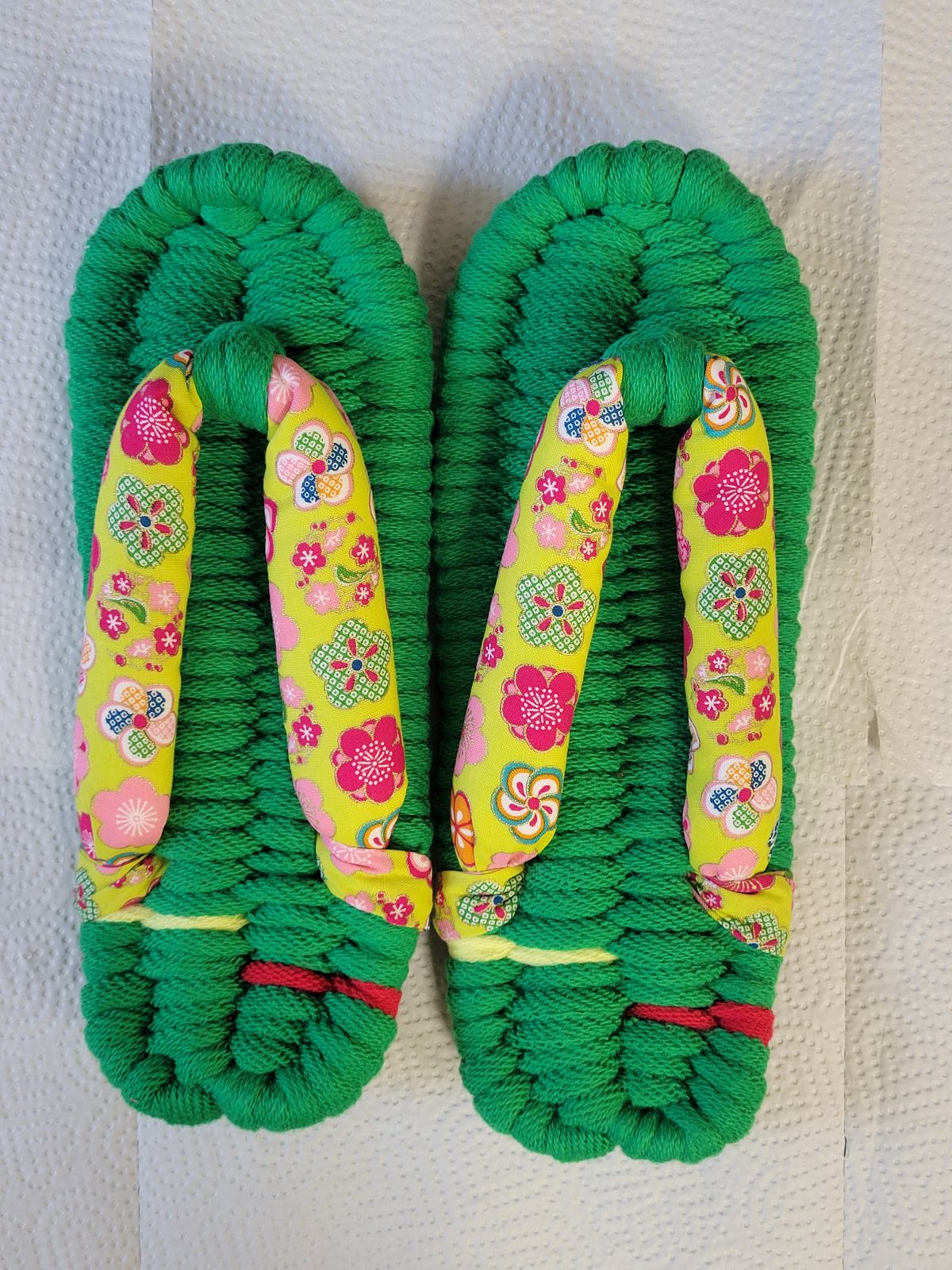 6足目です グリーンのベースに同系色のバンダナ柄の鼻緒がマッチしてPOPな布ぞうりです しっかり編まれました