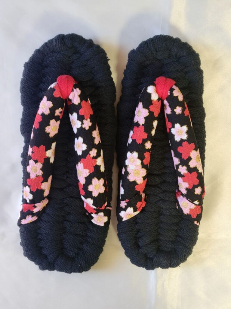 1足目です 黒のベースに桜柄の鼻緒が映えて素敵なモダンジャパニーズの布ぞうりが完成しました。前坪の色を赤にしたことで明るい印象になりました