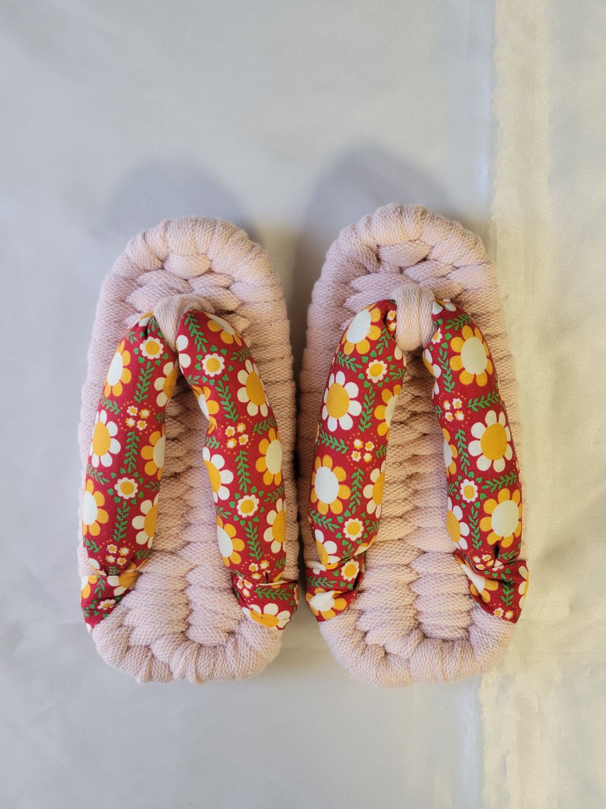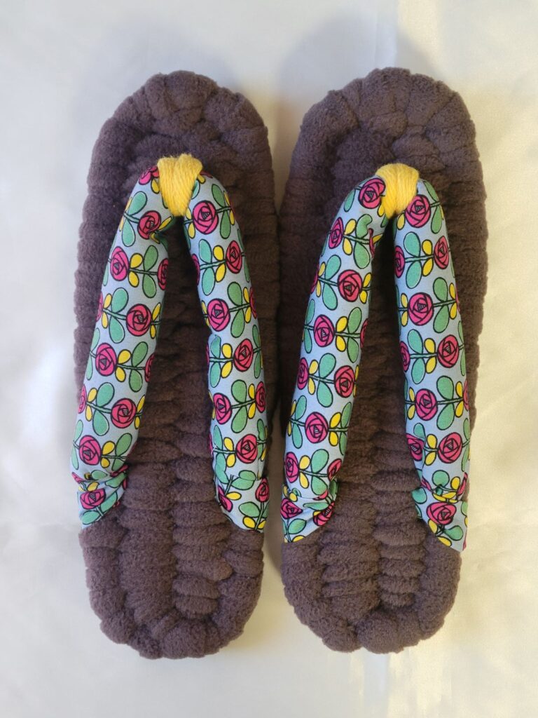 1足目です フリース布ぞうりです ブラウンのベースにPOPな薔薇模様の鼻緒を組み合わせておしゃれな1足に仕上がりました 前坪の黄色がアクセントになっています