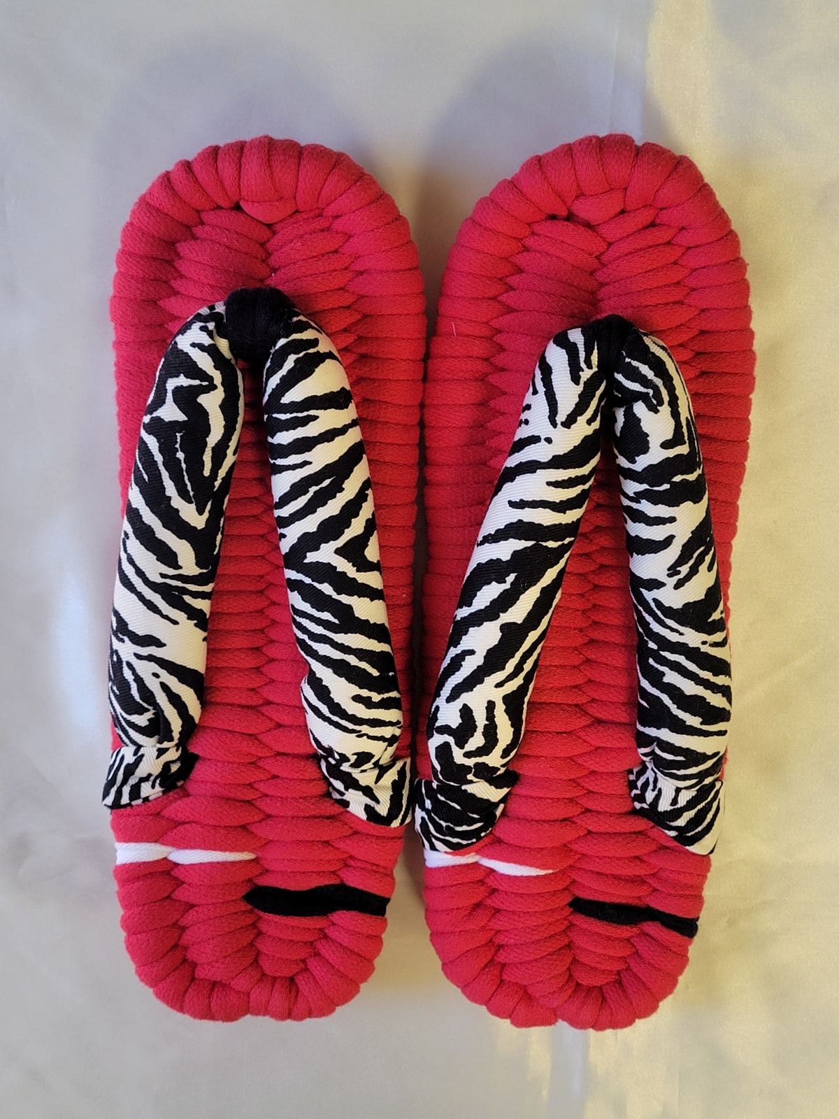 アドバンスコース 赤のベースにシマウマ柄の鼻緒を組み合わせて、コントラストが印象的な布ぞうりです 前坪と差し色をモノトーンにしたことではっきりした色合いになりました