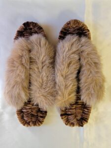 アドバンスコース 光沢のあるブラウンのベースにベージュのファーの鼻緒がマッチしたおしゃれな布ぞうりが完成しました 冬に足元が暖かいですね